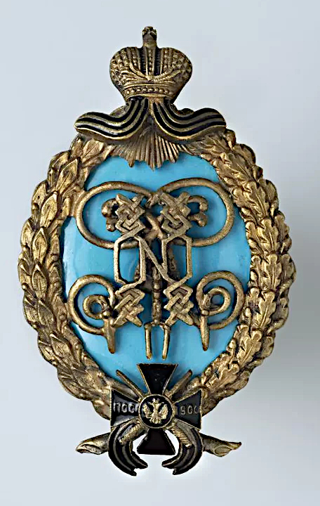 Знак 81-го пехотного Апшеронского Его Императорского Высочества Великого князя Георгия Михайловича полка.Утвержден 14 октября 1909 г. Венок увенчан золотой Императорской короной с ниспадающими из-под нее золотыми Георгиевскими лентами, между которыми проступают золотые лучи. Из-под Кавказского креста свисают концы Георгиевской ленты. Встречаются экземпляры со щитком, покрытым эмалью голубого цвета. Badge of the 81st Apsheron Infantry Regiment of His Imperial Majesty Grand Duke George Mikhailovich.Gold wreath of laurel and oak branches. At their intersection is a gold Cavcasian cross covered in black enamel with the gold dates «1700" and «1900". Inside the wreath is a small oval shield covered in white enamel, on which is laid the gold combined cypher of the Emperors Peter I and Nicholas II. The wreath is beneath the gold Imperial crown with gold St. George ribbons falling from it, from between which the gold rays emerge. The edges of the St. George ribbons are dangling from under the Cavcasian cross. On some badges the small shield is covered in blue enamel. Нагрудный знак 81-го пехотного Апшеронского полка. Аверс/Реверс. До 1917 г. Российская империя. Недрагоценный металл, эмаль, штамповка, монтаж, пайка, горячая эмаль. 58,5х36,5 мм. ГИМ |