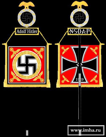Летом 1940 года эсэсовскому полку личной охраны Адольфа Гитлера ("Лейбштандарту СС Адольфа Гитлера») был (в ознаменование его боевых заслуг в ходе Западной кампании против Голландии, Бельгии, Франции и Англии) в возвращенном в состав Германской державы городе Меце вручен штандарт, отличавшийся, как своей формой, так и своим внешним видом, от прежнего (и от всех остальных штандартов полков СС). Аверс его квадратного (а не прямоугольного, как у всех других штандартов СС и СА) полотнища представлял собой копию аверса (и реверса) штандарта фюрера и рейхсканцлера Третьего рейха Адольфа Гитлера. В центре красного, обрамленного черно-белой каймой полотнища помещался черный, обведенный черным контуром прямостоящий крюковидный (гамматический) крест-коловрат (значительно большего размера, чем изображенный на обычных штандартах пеших полков СС), вписанный в белый круг, обрамленный круглым венком из золотых дубовых листьев, с четырьмя золотыми орлами на вписанных в золотые дубовые венки коловратах по углам полотнища, окаймленного пышной золотой бахромой.