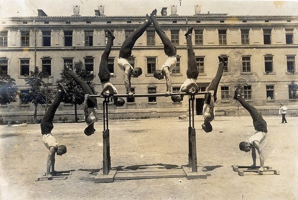 | Спортсмены показывают элементы сокольской гимнастики, базирующейся на упражнениях с предметами, на снарядах, массовых упражнениях и пирамидах. Родиной этой гимнастики является Автро-Венгрия, основатель – Мирослав Тырш, который был идеологом сокольского движения, основанном на идее славянской независимости от Автро-Венгрии. Сокольская гимнастика оказала влияние на европейскую гимнастику, в особенности на ее эстетику. Также она пользовалась популярностью в военных училищах России на рубеже веков XIX-XX. Действие происходит на Марсовом поле в Санкт-Петербурге. |