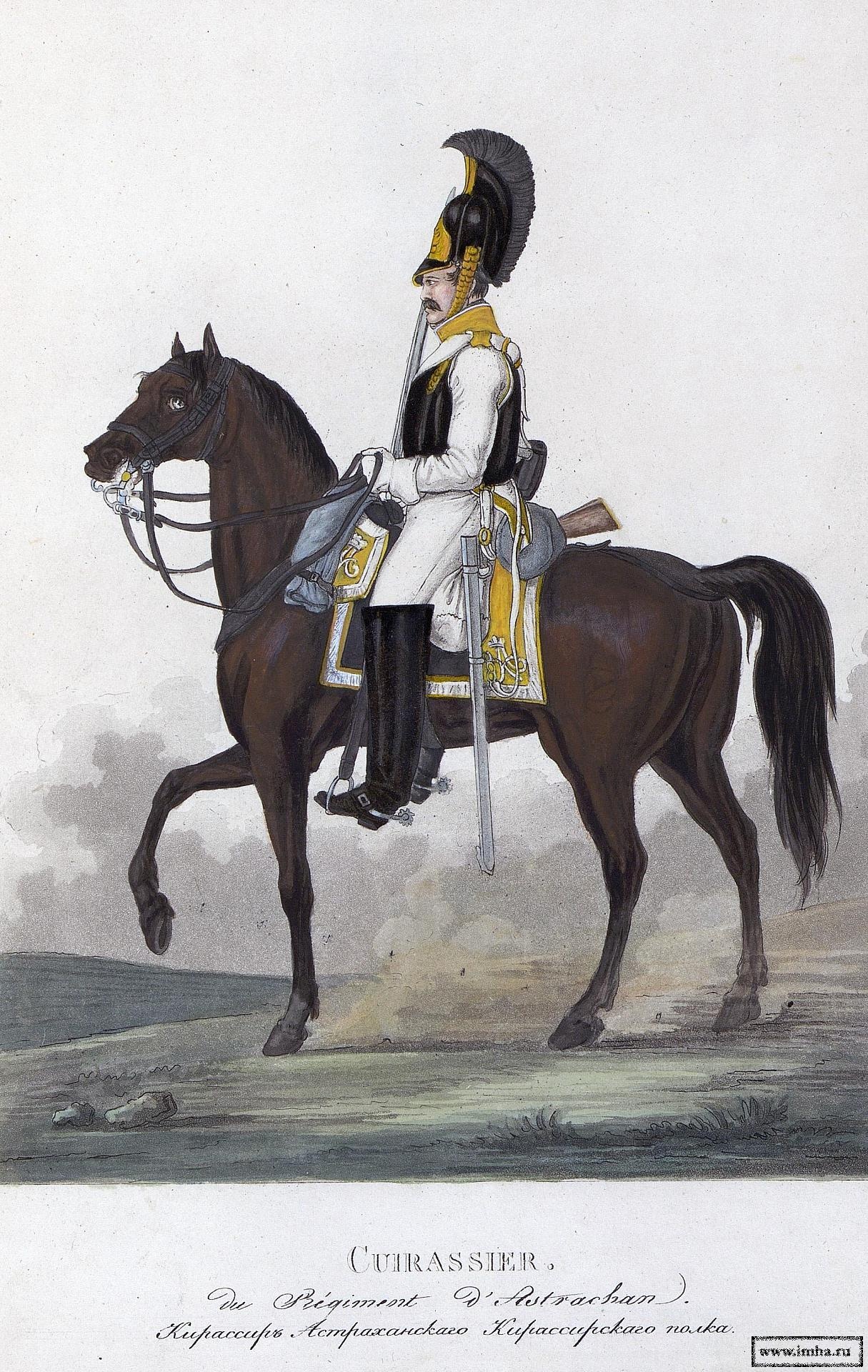 1811 г. Окт. 12. Из офицеров и нижних чинов, отделенных от полков: Лейб-Кирасирского Его Величества, Лейб-Кирасирского Ея Величества, Екатеринославского Кирасирского, драгунских: Рижского, Казанского, Ямбургского, Нежинского, Псковского, Московского. Финляндского и Митавского и Гусарских: Гродненского, Елисаветградского и Изюмского с дополнением рекрутами, сформирован, в г. Усвяте, Генерал-Майором Бороздиным, Астраханский Кирасирский полк, в составе 5-ти эскадронов. |