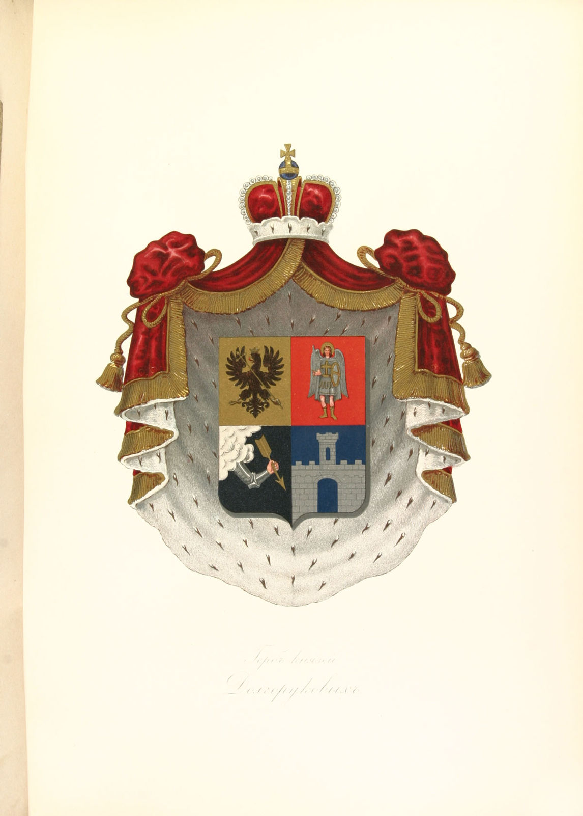 Герб князей Долгоруковых (Общий Российский Гербовник, часть 1, № 7): щит разделен на четыре части.В первой части, герб княжения Черниговского: в золотом поле, черный одноглавый орел, с золотою короною на голове, крылья у орла распростерты и в левой лапе держит больший золотый крест. Во второй части, герб Великого Княжения Киевского: в красном поле Ангел в одежде сребротканной; в правой руке держит обнаженный серебряный меч, а в левой золотой щит. В третьей части, в черном поле, выходит из облака рука со стрелою, в латы облеченная. В четвертой части, в голубом поле, серебряная крепость. Щит покрыт княжескою мантиею и российской княжескою шапкой. |