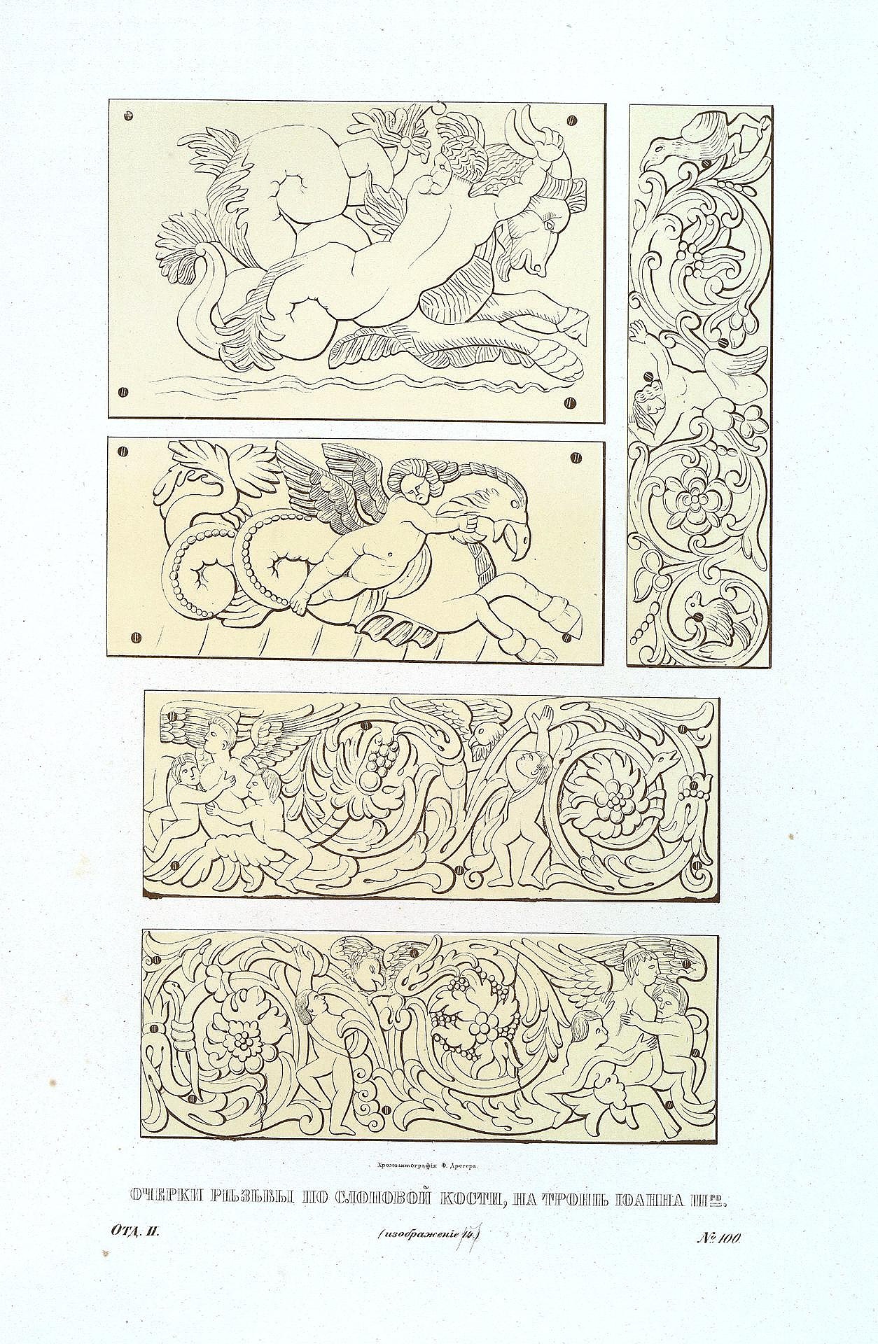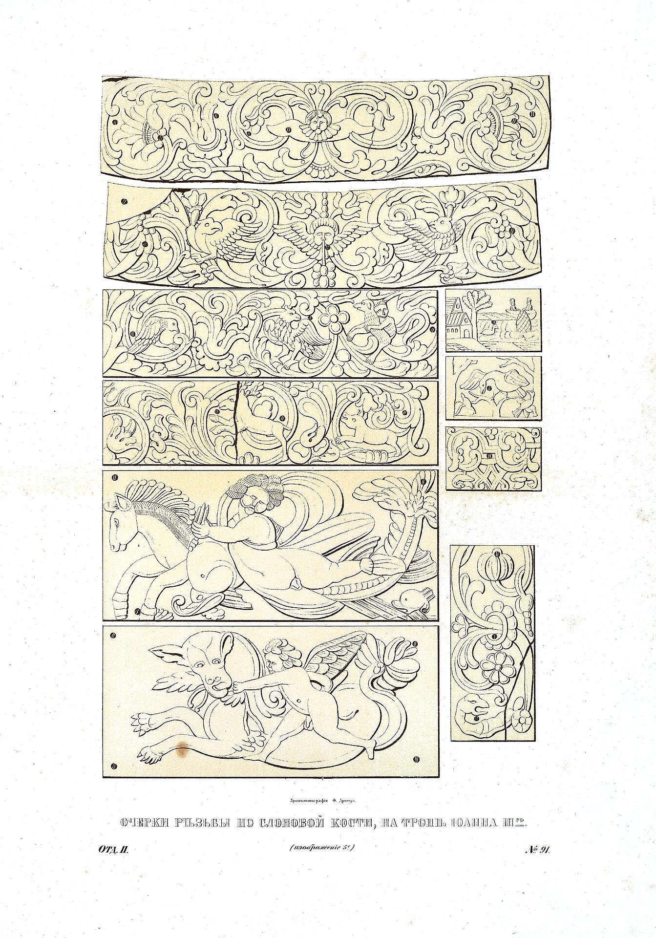 | Фрагменты резьбы по слоновой кости на троне Великого князя Иоанна III-го. Россия, Москва, 1851 г. Автор оригинала: Солнцев, Фёдор Григорьевич. 1801-1892. Бумага, хромолитография Дрегера Ф. ГЭ |
