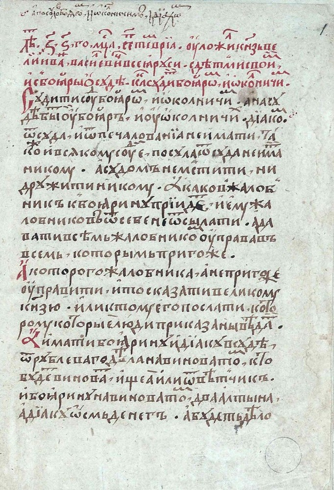 | Судебник Ивана III. 1497 г. Российский государственный архив древних актов Ф. 135. Государственное древлехранилище хартий и рукописей. Отд. V. Рубр. I. № 3. Л. 1–12. Список начала XVI в. Плотная лощеная бумага, чернила; полуустав и скоропись. 29,2 см х 15,1 см |