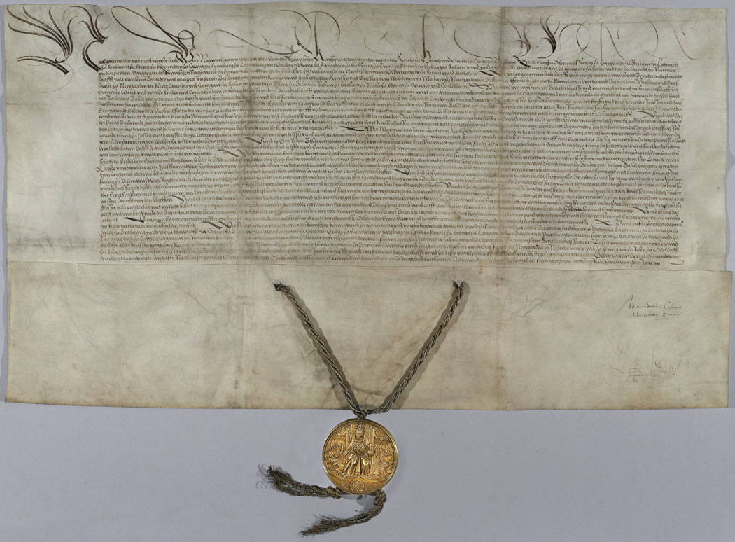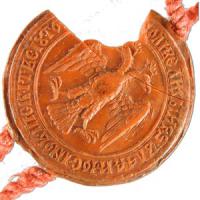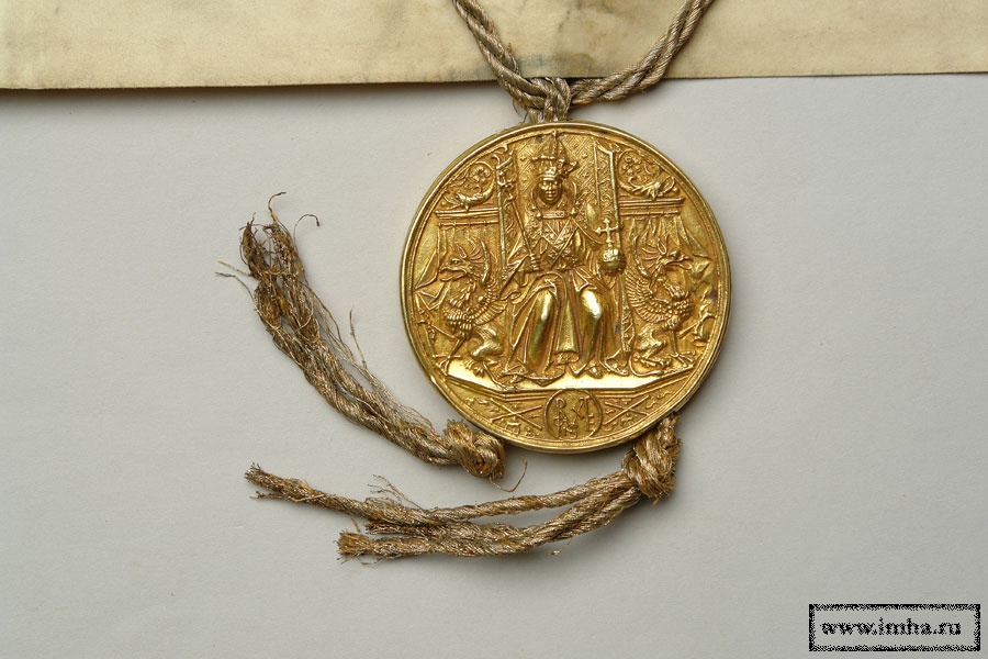 | Печать великого князя Ивана Васильевича, красновосковая (утрачен фрагмент), вислая на красном шелковом шнуре. Российский государственный архив древних актов Ф. 135. Государственное древлехранилище хартий и рукописей. Отд. I. Рубр. II. № 78. |