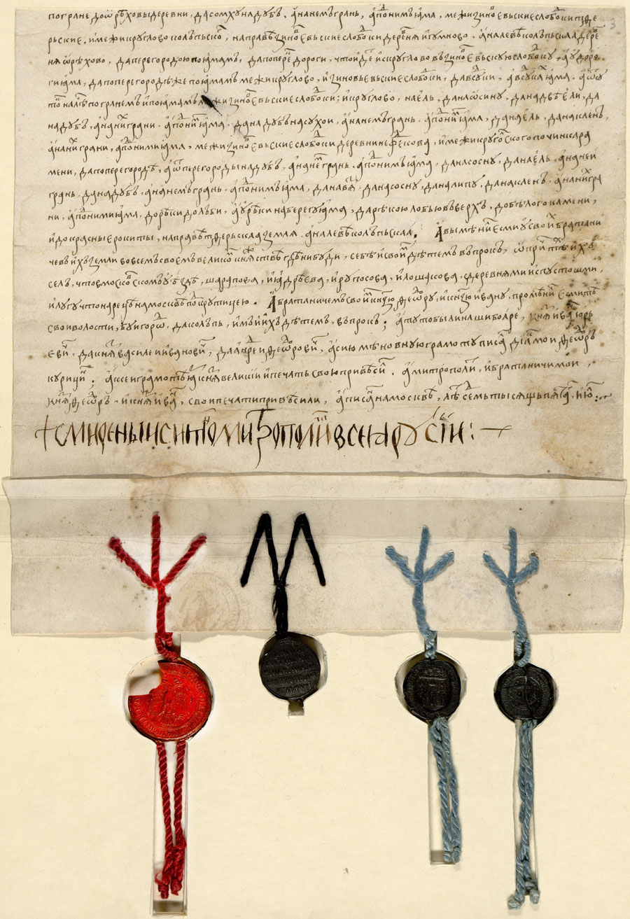 Грамота впервые скреплена печатью великого князя Ивана III с изображением двуглавого орла, ставшего с этого времени государственным гербом. Традиционно считается, что двуглавый орел был заимствован из Византии после брака великого князя с византийской царевной Софией Палеолог. Современные исследователи выдвигают также гипотезу, что орел был заимствован из Священной Римской империи и символизировал равенство статуса великого князя московского и императора. К концу XV в. завершился процесс складывания единого Русского государства, и полный титул Ивана III теперь звучал как «государь всея Руси и Великий князь Владимирский, и Московский, и Новгородский, и Псковский, и Тверской, и Пермский, и Югорский, и Болгарский, и иных». В 1497 г. волоцкие князья просили об обмене их «отчинных» сел, находящихся в восьми уездах московских великокняжеских земель, на тверские волости, ближайшие к их уделу. Этой жалованной грамотой Великий князь скрепил обмен со своими племянниками. А братаничем своим, князю Феодору и князю Ивану, променил есми те свои волости Буигород да Колпь им и их детем впрок. А туто были наши боаре: князь Иван Юрьевич, да князь Василеи Иванович, да Андреи Феодорович. А сию меновною грамоту писал диак мои Феодор Курицин. А к сеи грамоте яз, князь великии, и печать свою привесил. А митрополит и братаничи мои, князь Феодор и князь Иван, свои печати привесили. А писан на Москве, лета семь тысящ пятаго, июля. Смиреный Симон, митрополит всей Руси». |