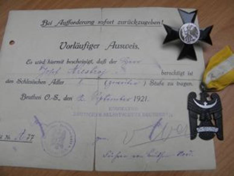 Эмблема; желто-бело-желтая (с полосами по горизонтали) нарукавная повязка с черным прусским Железным крестом (геральдических цветов Верхней Силезии); нарукавная нашивка в форме желтого знамени с белой каймой, усеянного черными звездочками, с черным прусским Железным крестом в белом круге посредине полотнища знамени, на черном древке с черными же кистями.