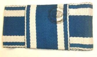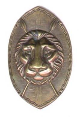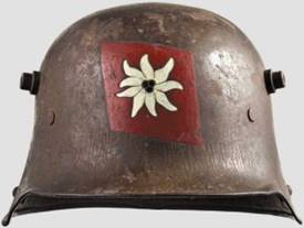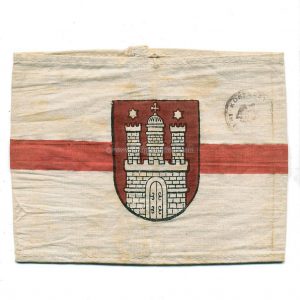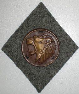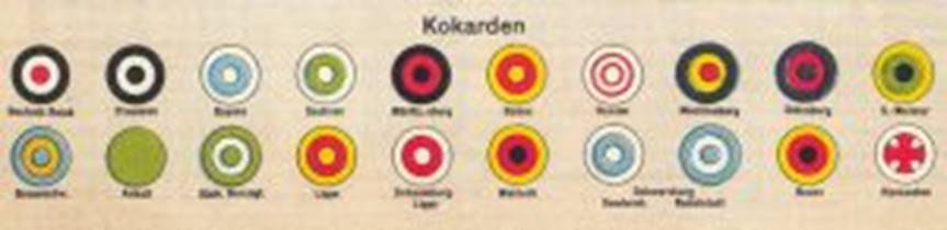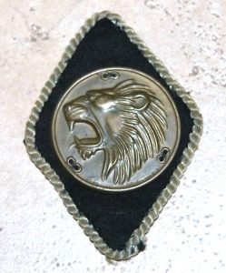 39. Добровольческий корпус «Верденфельз». Эмблема: бело-голубая (цветов баварского флага) нарукавная повязка с эмблемой Баварского стрелкового корпуса – львиная голова в профиль в круглом медном медальоне на черном ромбе (иногда — без львиной головы) и названием фрайкора черными буквами на верхней (белой) полосе повязки.