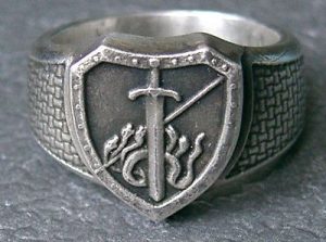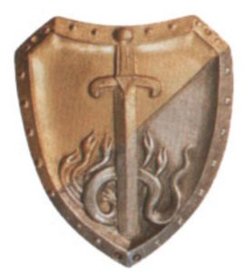 Эмблема: желто-белый «варяжский (норманнский)» щиток, разделенный по вертикали, с изображением меча острием вниз, вонзенного в клубок змей; мог носиться на рукаве или же слева на груди.