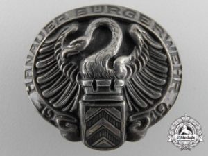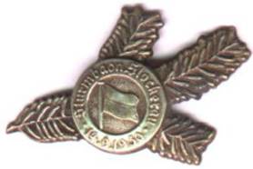26. Брауншвейгская самооборона («Зельбстшуц Брауншвейг»). Эмблема: нагрудный знак в форме горизонтального овала с изображением сокола в профиль и надписью «Зельбстшуц» над и «Брауншвейг» под соколом.