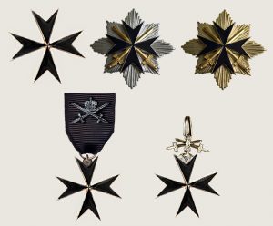 Эмблема: нагрудный «варяжский» («норманнский») щит белого металла с наложенным на него изображением лапчатого черного, с серебряной каймой, нагрудного кавалерского креста Тевтонского рыцарского Ордена.
