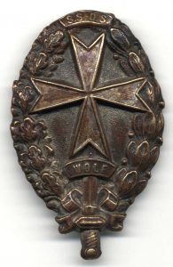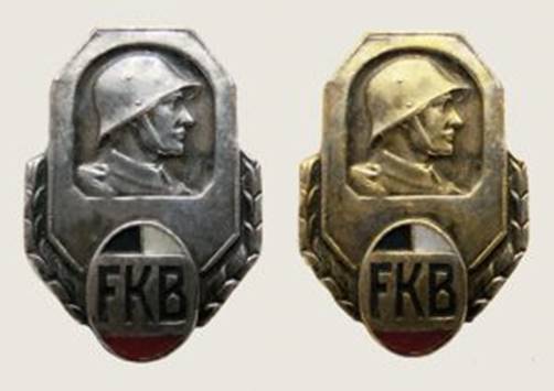 Эмблемы: металлический дубовый венок, внутри венка – прямоугольная пластинка с латинскими буквами F.S.W.; аналогичная эмблема меньшего размера носилась и в петлицах.