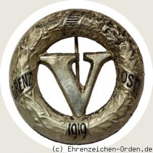 Эмблема: круглый нагрудный знак в форме римской цифры V, окаймленной лавровыми (справа) и дубовыми (слева) ветвями, переплетенными лентами с надписями «Пограничная» справа, «Охрана» вверху, «Восток» слева и «1919» внизу.