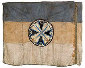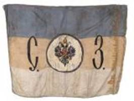 красно-сине-белый стяг с черным двуглавым орлом Российской империи в белом круге и синими славянскими литерами «С» и «З» по бокам орла (данное знамя использовалось еще до разрыва князя Авалова с генералом Н.Н. Юденичем, пока аваловские войска считались — по крайней мере, формально! -частью белой Северо-Западной Армии Юденича, Родзянко и Дзерожинского); белые флаги и значки с черным мальтийским крестом; русская овальная кокарда (нередко носившаяся состоявшими в армии германскими добровольцами в сочетании с черно-бело-красной кокардой старой кайзеровской армии). Некоторые немецкие добровольцы Западной Армии, недостаточно хорошо знавшие русскую православную символику, носили на рукаве, вместо восьмиконечного православного креста, белый «патриарший» («лотарингский») крест с 2 поперечными перекладинами (иногда в синем круге с красной каймой – опять-таки, цветов русского национального флага).