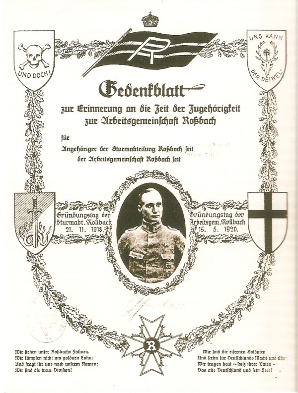 Утверждение же современного российского сочинителя Ю.М. Москвина, содержащееся в послесловии к переведенному им труду Т. Уилсона «История свастики с древнейших времен до наших дней», Нижний Новгород, «Книги», 2008, с. 488) о наличии у «Свободного корпуса Россбах» (так его именует г-н Москвин) знамени, на котором, якобы, «красовалась большая свастика вкупе с «мертвой головой», а по углам были вышиты лавровые венки», является таким же плодом вымысла автора, как и приведенное им там же фантастическое описание знамени бригады Эргардта в виде «национального триколора со свастикой, увенчанной стальным шлемом».