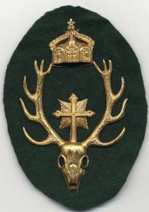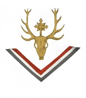 Эмблема: овальный металлический нарукавный знак с выгравированным на нем рельефным изображением черепа оленя анфас с окруженным сиянием латинским «крестом Святого Губерта» между оленьими рогами.