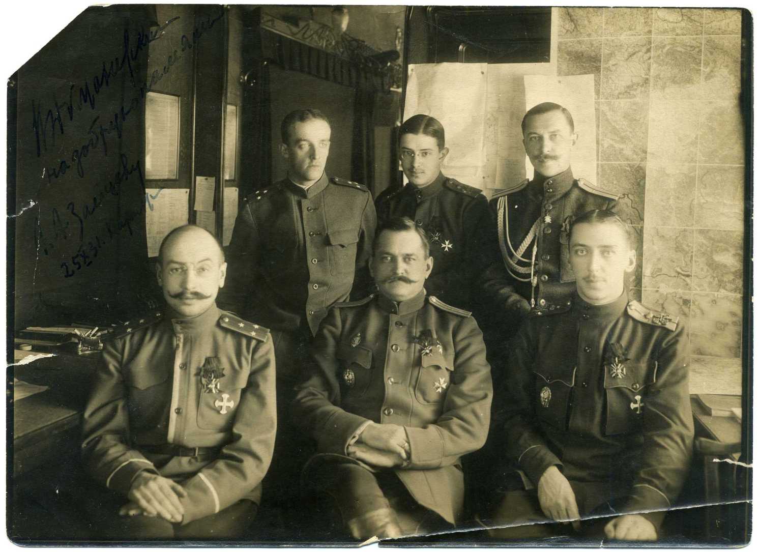 Сидят слева направо - поручик Зайцов Арсений Александрович, полковник Доманевский Владимир Николаевич, поручик Подгутков (есть версия что это Иванов-Дивов Александр Владимирович). Стоит справа - Люндеквист Владимир Альмарович.Источник фото: http://ria1914.info
