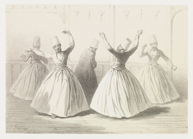 | Кружащиеся Дервиши. Стамбул. Между 1840-70 гг. Османская империя. Худ. Gaildrau, Jules, 1816 - 1898 Литография. Музей Виктории и Альберта. |