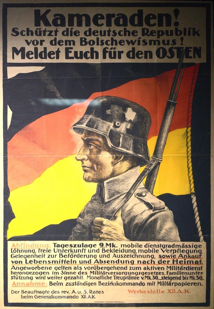 12 декабря 1918 года правительство Фридриха Эберта, обеспокоенное наличием у населения сотен тысяч бесхозных "стволов", по согласованию с Верховным Руководством Вооруженных Сил, объявило о создании "Добровольного народного ополчения" ("Фрейвиллиге фольксвер"), в состав которого планировало включить все существовавшие на тот момент вооруженные формирования. Но осуществлению этого плана воспротивились "спартаковцы", не желавшие лишаться своих ударных отрядов, необходимых им для вооруженного государственного переворота по ленинскому образцу. Наибольшая угроза Временному правительству Эберта исходила от прибывшей из балтийских портов и расквартированной в Берлине "Народной военно-морской дивизии" ("Фольксмаринедивизион"), объявившей себя частью новой республиканской армии, но на деле проникнутой большевицким духом и постоянно затевавшей провокации и перестрелки с немногими верными Временному правительству армейскими и полицейскими частями. Легко предположить, в какую кровавую пропасть оказался бы ввергнутым весь мир, если бы советской Красной Армии удалось прорваться в охваченную беспорядками Германию через Польшу и, по ленинскому замыслу, "соединить русский серп с германским молотом". Казавшиеся в описываемое время поистине неисчерпаемыми людские ресурсы взнузданной товарищами Л. Д. Троцким и В. И. Лениным России и въевшиеся в плоть и кровь немецкого народа дисциплина и любовь к порядку, русский хлеб (отнятый большевицкими "продотрядами" у крестьян) и германская техника, поставленные на службу Коммунистическому Интернационалу, представляли реальную угрозу всем лучшим достижениям мировой цивилизации. Но на пути красного Молоха в Германии, как и в России, встали белые добровольцы.