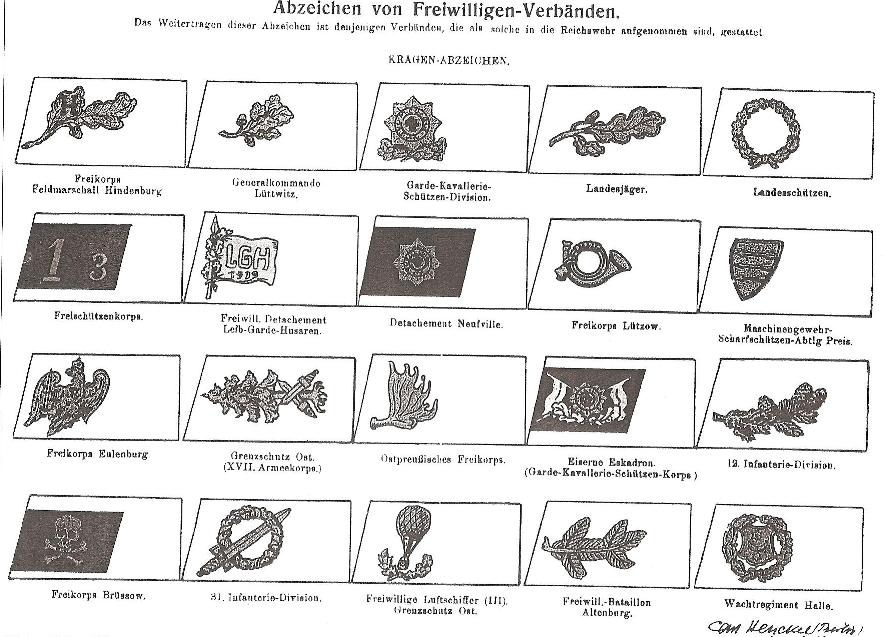 Таблоид заимствован нами из II части небольшой униформологической брошюры "Новый германский рейхсвер", опубликованной в 1919 г. в Лейпциге, под названием "Добровольческие части и их опознавательные знаки в сделанных с оригиналов рисунках Карла Хенкеля".