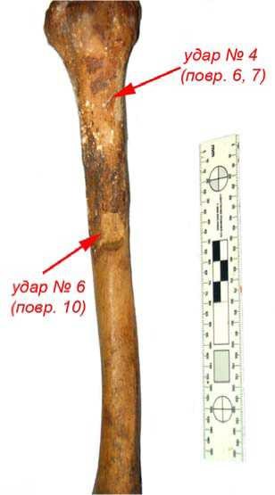 Орудия убийства, механизм образования повреждений. Повреждения 1-7, 11-13, 15 (6 ударов) причинены острым рубяще-режущим орудием с длинным лезвием (типа сабли) и, как правило, охватывают несколько костей. Это свидетельствует о том, что рассечение-разруб мягких тканей сочетался с их широким разрезом, в пользу чего говорит острый угол наклона орудия к плоскости повреждённых костей (40-45°). Исключением является повреждение бедра, где этот угол заметно больше (60-65°). Повреждения 14 и 16, возникшие от ударов в голову, а также повреждения левого предплечья и плеча (8-10) причинены массивным остро-рубящим орудием с длинным лезвием (типа меча). Угол наклона этого орудия при разрубе левого предплечья близок к 90°. Что касается повреждений на левом плече, левой затылочной и правой лобной областях, то удар мечом наносился под острым