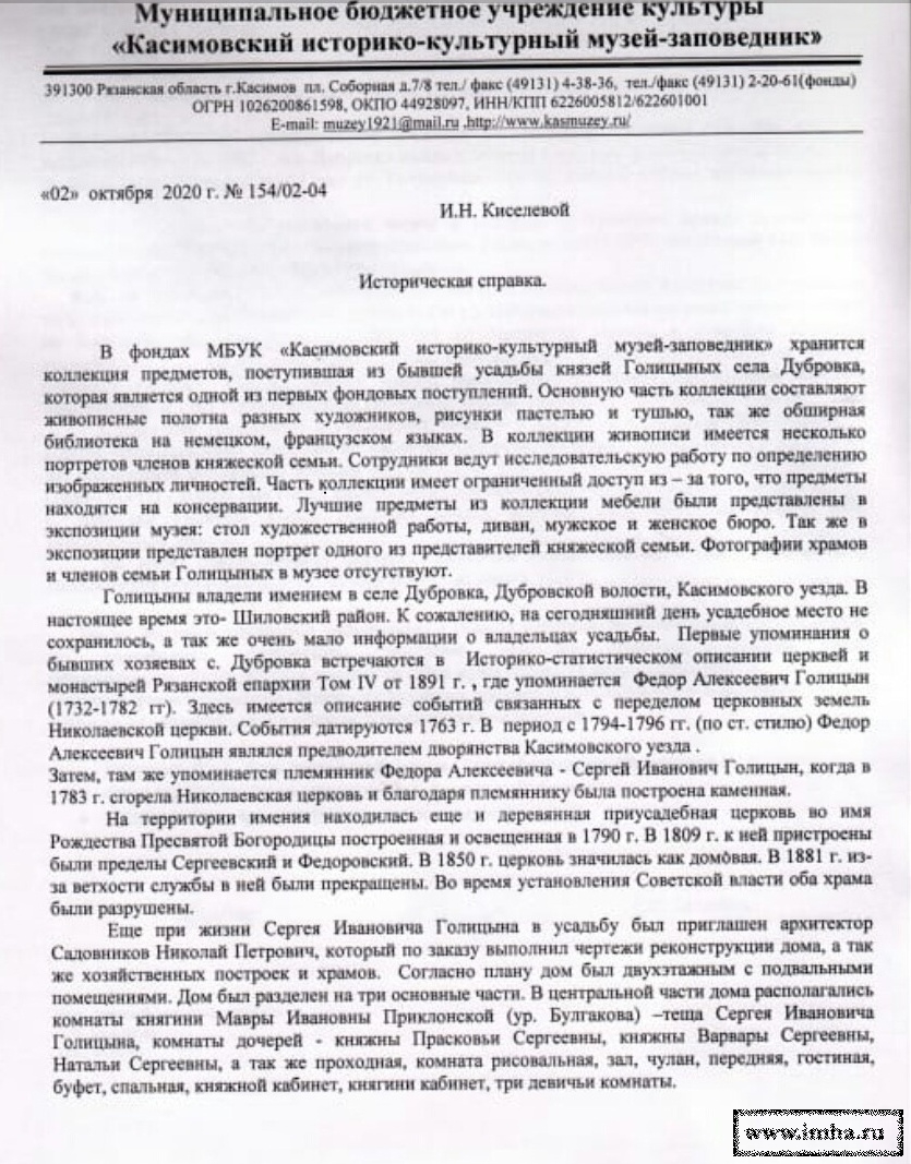 Историческая справка от 2 октября 2020 года, полученная из Касимовского краеведческого музея.
