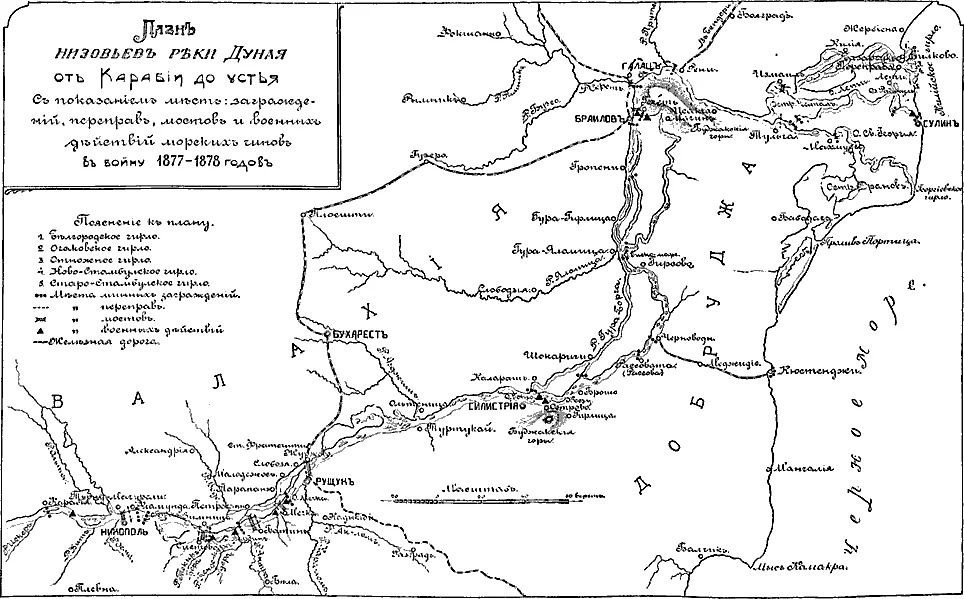 Наши же морские силы числили всего 14 паровых катеров и 20 гребных судов и должны были прибыть к Дунаю сушею с 600 чел. Гвардейского и Черноморского экипажей. Только с помощью нового оружия, мин, м. б. выступить против сильнейшего неприятеля; действия морских отрядов заключались, главным образом, в постановке минных заграждений с таким расчетом, чтобы разбросанные по Дунаю турецкие отряды были отрезаны от намеченных мест переправы.