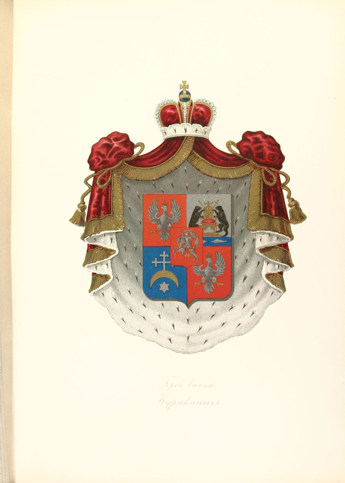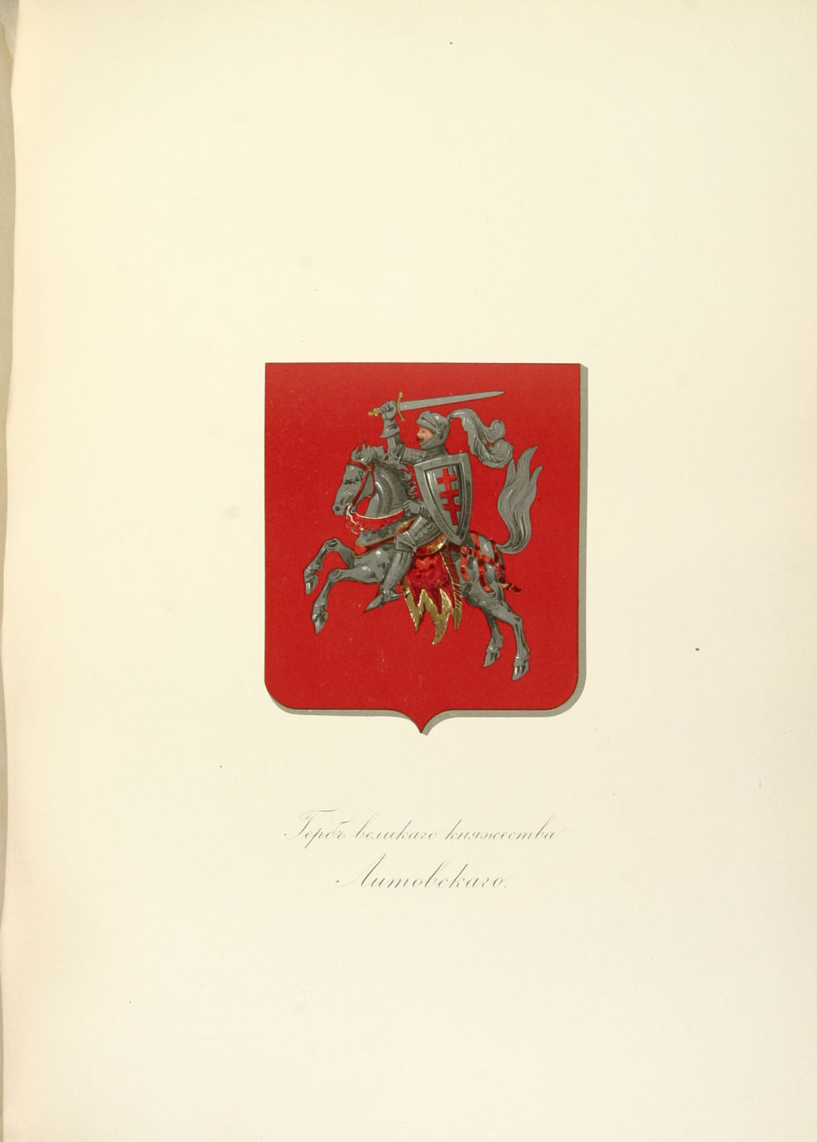 ![Герб Великого Княжества Литовского. Герб Великого Княжества Литовского - Погоня: в червленом поле скачущий на белом коне рыцарь в серебряных латах, держащий в левой руке серебряный щит, на коем осьмиконечный червленый крест, а в правой подъятой руке меч.]()