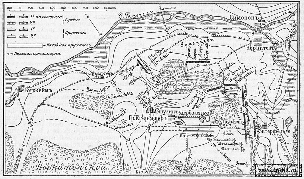 К 16 августу 1757 г. вся русская армия фельдмаршала гр. Апраксина сосредоточилась на левом берегу р. Прегеля у Норкитена, а на правом берегу остался лишь слабый арьергард Панина (см. Семилетняя война). Русский лагерь был расположен на равнине между Прегелем и впадающим в него ручьем Ауксин, позади болотистой серповидной рощи, проходимой лишь по двум дорогам из Норкитена в Аллеабург: через ГРОСС-ЕГЕРСДОРФ и чрез Зитерфельд. К западу от ГРОСС-ЕГЕРСДОРФА простираются обширные Норкитенский и Астроишкинский леса, прикрывающие м. Велау |