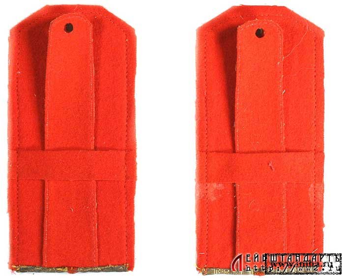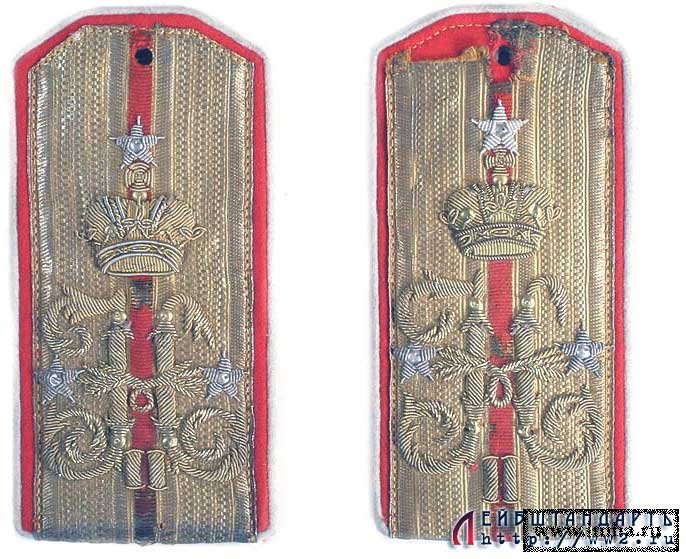 Поверхность погон из позолоченного галуна с одним красным просветом и красной окантовкой, погоны с белой каймой. Золотом вышит вензель Императора Николая II под короной, звезды вышиты посеребренной нитью. Красная суконная подложка отреставрирована. Носились при служебной и праздничной форме. (Источник: http://www.ww2.ru/) |