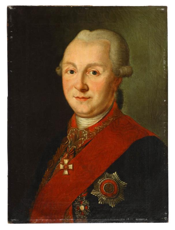 Неизвестный художник с гравюры худ. Г.И.Скородумова Портрет генерал-майора Ивана Ивановича Михельсона (1740 – 1807). Конец XVIII в., холст, масло, 63,8Х46,4 см. Российская Империя. С.-Пб. ГБУК "Государственный мемориальный музей А.В. Суворова" Поясной портрет мужчины средних лет в 3/4 повороте вправо, в пудренном парике с буклей и косицей. Одет в синий мундир с красным воротником, золотыми пуговицами и золотым шитьем генерал-майора по краю воротника и по полам кафтана. Под расстегнутым кафтаном виден красный с золотыми пуговицами и шитьем камзол и белый галстук на шее. Через левое плечо красная лента ордена св. Александра Невского, звезда этого ордена на левой стороне груди, на шее крест ордена св. Георгия III степени. Фон темный, коричневато-серый, с высветлением с правой стороны. Подрамник прямоугольный. Холст авторский, полотняного плетения, плотный, среднезернистый. |