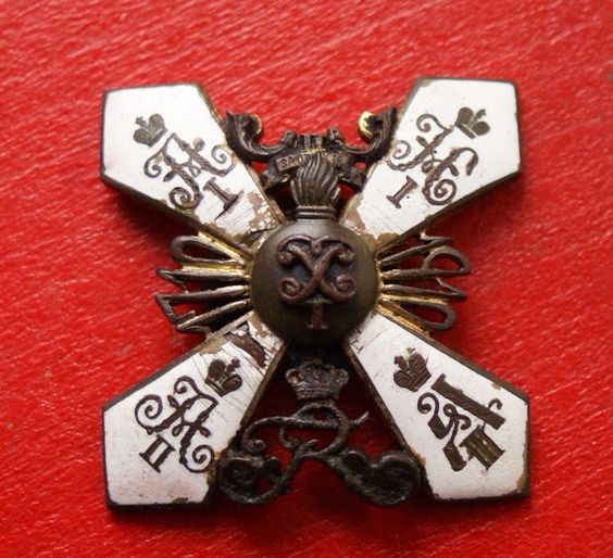 On the rays of the cross are the gold cyphers of the Emperors Alexander I, Nicholas I, Alexander II and Alexander III beneath gold Imperial crowns. In the centre of the cross is a silver oxidized grenade with gold flames, on top of which is the gold cypher of the Emperor Peter I. Between the upper rays of the cross is the gold cypher of the Emperor Nicholas II beneath the gold Imperial crown. Underneath the cypher is an applied gold ribbon (the badge differs on the head gear of the ranks of the Regiment) with the inscription «За Отличiе» (For Distinction). Between the lower rays of the cross is the gold cypher of King Friederich-Wilhelm IV of Prussia. On the left and right of the grenade are the dates «1710» and «1910» marked in gold.