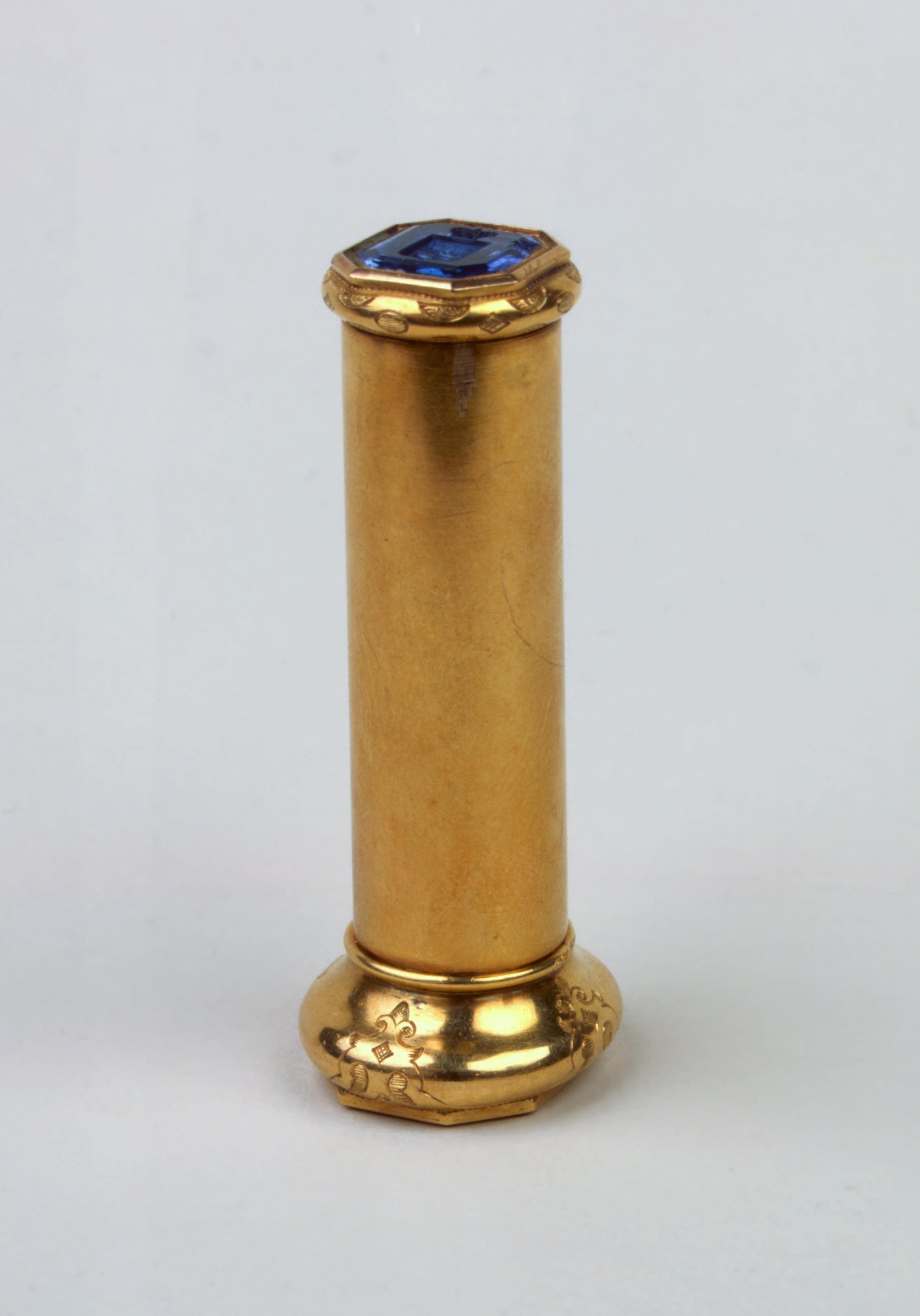 Печать в форме цилиндра с гербами князя И.Ф. Паскевича-Эриванского. Россия, Санкт-Петербург, 1845-1864 гг. Мастер: Арндт, Самуэль. 1812-1890. Золото, сапфиры, резьба, гравировка, полировка. Высота: 5,3 см; матрицы: 1,1x1,5 см и 0,9x1,1 см. ГЭ. |