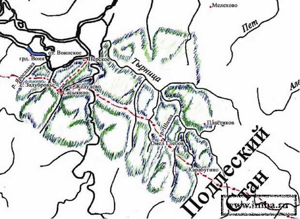 Исторические документы так описывают период шишей времен в.кн. Олеги Ивановича. На восточной границе, князь взял у церкви "Омёл Глебов», чтобы здесь разместить свои дружины для прикрытия "Большой дороги».Он локализуется на р.Тырнице, на месте села Глебово. А взамен, отдал церкви земли между речками Непложа и Крутица – именуемые по имени г.Воино (ныне д.Городище) и оз.Воинского - ВОИНСКИМ УЕЗДОМ.
