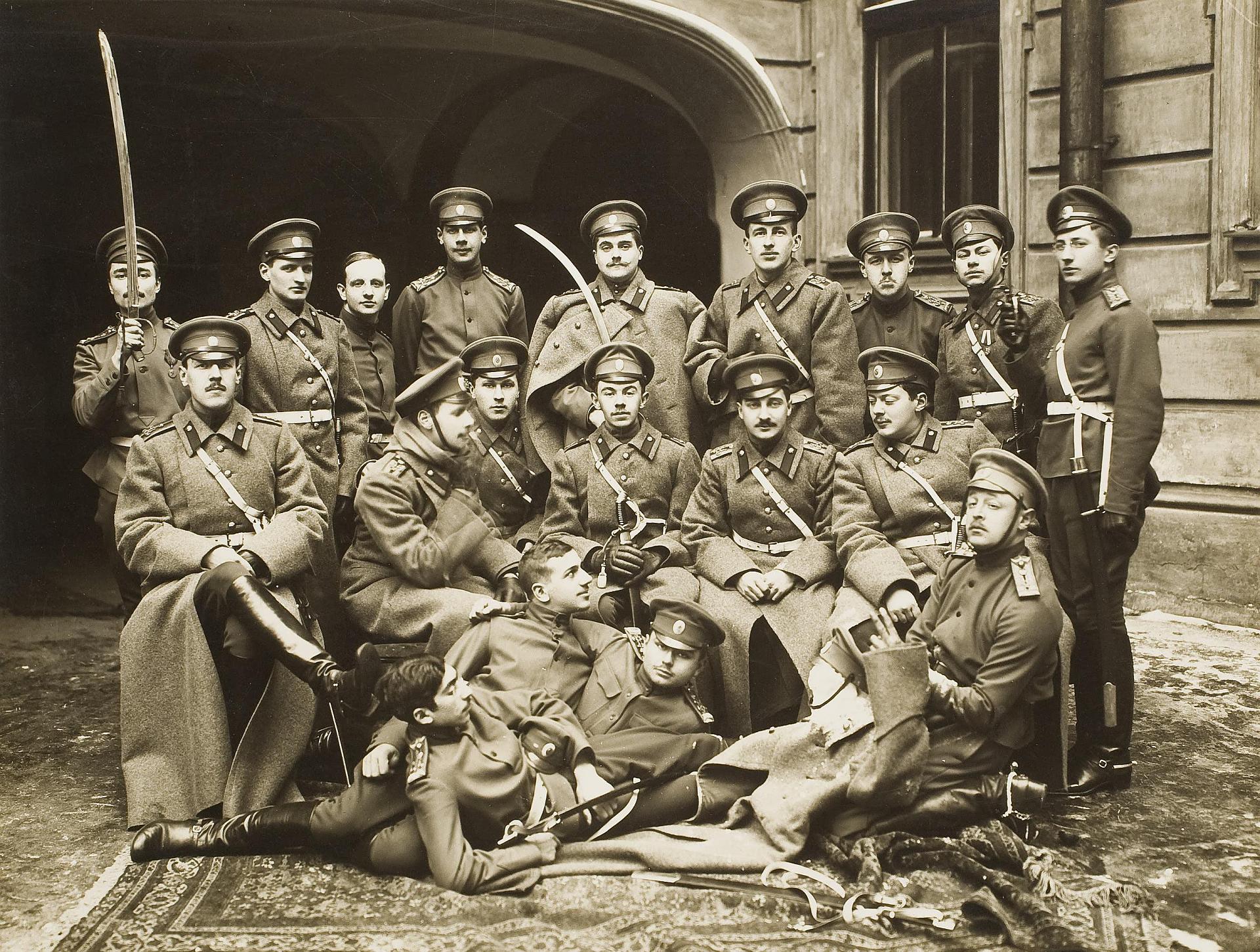 | Групповой портрет пажей выпускного класса Пажеского корпуса. Россия, 1915-е гг. Фотография: бромсеребряный отпечаток, фирменное паспарту. 21,5х28; 35х45 см. |