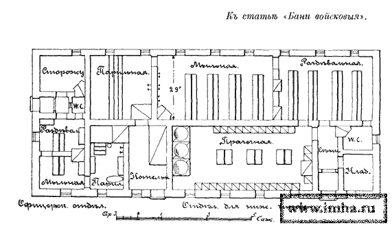 Устройство войсковых Бань в районах казарменного расположения, признается в настоящее время необходимым. Расчет полковой Бани наиболее распространенного типа ведется на 50 человек в смене, полагая в полку в среднем около ... |