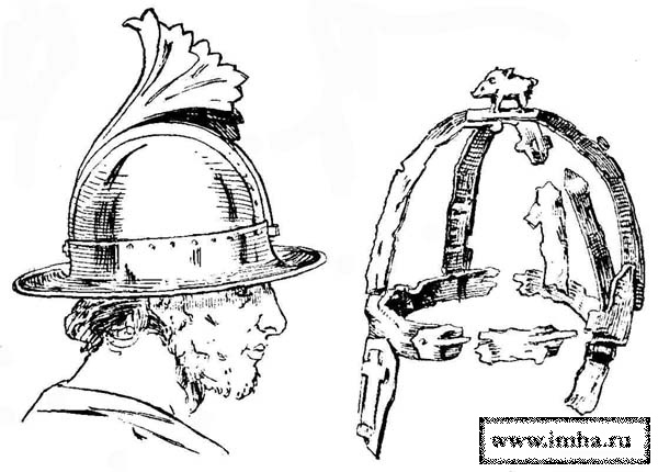 Рис. 1. Бронзовый шлем. Найден в захоронении под Сесто-Календе (без изображенного здесь гребня). Датируется прим. IV в. Музей Миланской академии. Рис. 2. Каркасный шлем, т. н. "кабаний". Железные ленты местами украшены серебром; ребра каркаса соединены роговыми пластинами; фигурка кабана вырезана из железа, с бронзовыми глазами. Найден в могильнике под Монайджешем (Дербишир). Германия, VII в. |