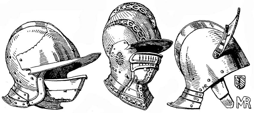 | Рис. 40. Бургиньот. Опускной подбородник самостоятельно крепится к бармице, охватывая ее; бургиньот надевается отдельно сверху. От полудоспеха Франца фон Кастелальто (ум. 1550). Ок. 1525 г. Рис. 41. Закрытый немецкий бургиньот. Со съемным забралом; верхняя полоса забрала изображена опущенной. От доспеха императора Фердинанда I, прозван "доспех с лепестками роз". Предположительно работа Ганса Розенбергера. Дрезден, ок. 1560 г. Рис. 42. Бургиньот. С подвижным назатыльником, откидным козырьком и подвижным подбородным ремнем. Нюрнберг. Работа Мерт. Ротшмида (ум. 1597), кон. XVI в. Земельный цейхгауз в Граце. |