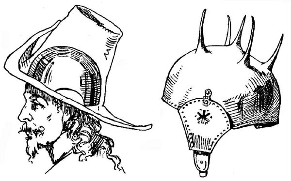 | Рис. 51. Морион, с гладким гребнем, чеканными украшениями и черненым рисунком. Головной убор младшего командира ополчения Пассау, возглавлявшегося эрцгерцогом Леопольдом V. Германия, ок. 1603 г. Рис. 52. Простой кабассет. Кон. XVI в. Цейхгауз в Граце. |