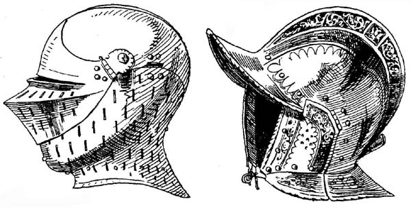 В начале XVI века появились ожерелья, и почти сразу постарались соединить их со шлемом. Верхний край ожерелья выполняли в виде выступающего жгута, гладкого или витого. Нижний край шлема выковывался в виде полого жгута, который схватывал жгут ожерелья, свободно скользя по нему, не выходя из зацепления. Шлемы с полыми жгутами называли бургундскими арметами. Их не следует путать с бургиньотами, о которых речь пойдет позже. Тогда же появилось и забрало, которое получило наибольшее распространение. Оно имело гладкие стенки, острое вертикальное ребро и смотровую щель с защитной отбортовкой (рис. 32).