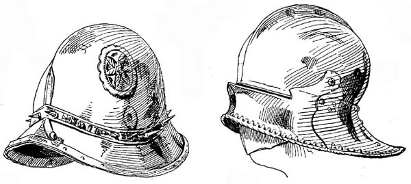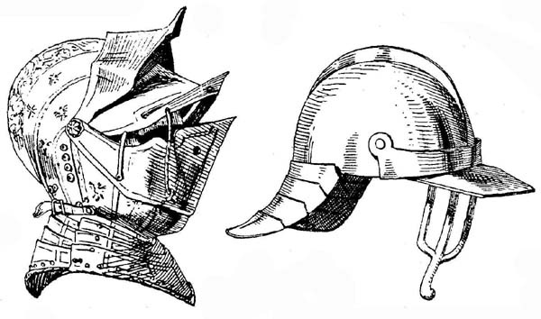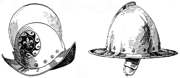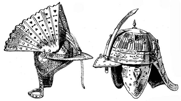 Во второй половине XVI века конструкцию арметов упростили еще больше. Забрало заменили подъемным козырьком и вертикальной пластиной или решеткой, соединенными вместе. В нидерландских и английских армиях конные стрелки носили шишаки с подобными козырьками и решетками, но состоящими только из трех прутьев (рис. 34).