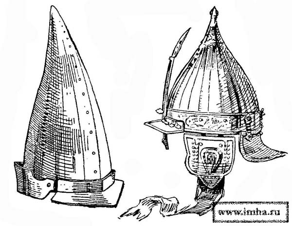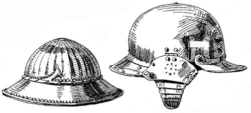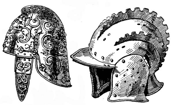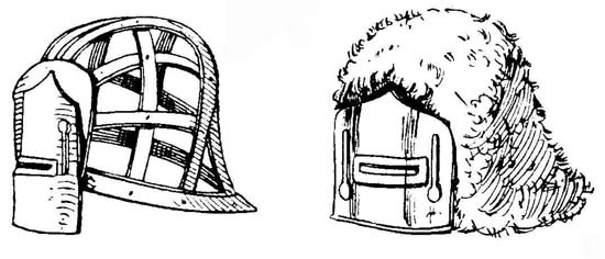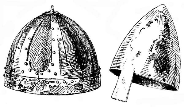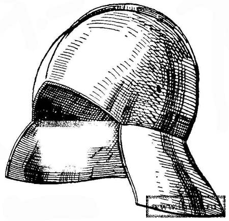 Головной убор италийских воинов в начале средневековья состоял из полукруглой тульи, выполненной из бронзы или листового железа, склепанного из нескольких частей, к нижнему краю которого прикреплялись горизонтальные узкие поля. Посредине спереди назад проходил листообразный разукрашенный гребень - смутным напоминанием о шлемах времен процветания Рима (рис. 1). С незначительными изменениями эта форма шлема существовала с гальштадтского периода, т. е. с V века до н. э. до великого переселения народов. Намного проще был шлем воина варварских народностей V века. Он представлял собой низкий колпак конусообразной формы, изготовленный из ряда пластин, склепанных вместе. К краю его подвешивалась бармица (нем. Halsbriinne) из кольчуги или кожи, обшитой кольцами, прилегавшая под подбородком к шее. Древнейшая форма этой бармицы встречается на Востоке.