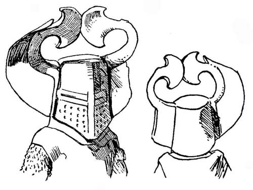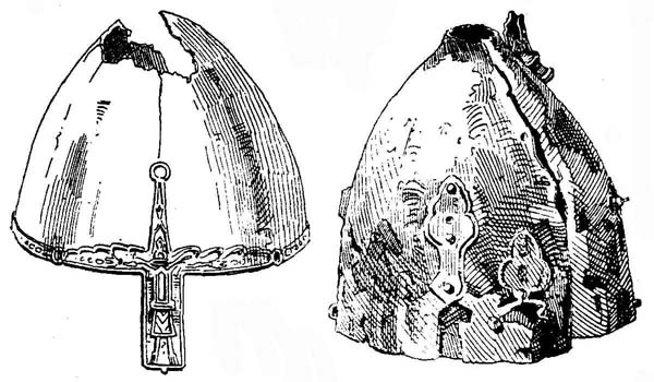 У германцев шлемами обладали только знатные особы. Шлемы состояли из медных и, нередко, роговых пластин, укрепленных на железном каркасе. Один из таких каркасных шлемов был найден в могильном холме под Монайджешем в Дербишире. Он уже снабжен железным наносником с серебряным крестом. На макушке шлема укреплена фигурка кабана из железа (рис. 2). Это типичный каркасный шлем, который играл у германцев значительную роль во времена перехода от язычества к христианству и неоднократно упоминается в балладе о Беовульфе. [27]