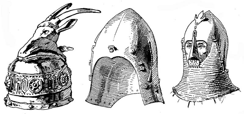 Всем этим формам был присущ железный наносник, который со временем становился все длиннее и шире, а в Германии появилась даже прочная заслонка для лица - или наличник (нем. Visier)4). Отчетливее всего видны изделия оружейных мастеров на миниатюрах из коллекции Геррада Ландсбергского. В этот период широко распространяется обычай украшать шлемы золотом и драгоценными камнями. Среди всех этих беспорядочных попыток усовершенствовать шлем практический опыт первого (1095-1099) и второго (1147-1149) крестовых походов сыграл решающую роль и за удивительно короткое время вызвал значительные изменения в форме шлема. Появляется цилиндрический или даже полукруглый по форме шлем большого объема, охватывающий голову полностью, причем обитая изнутри подкладкой макушечная часть его ложится на кольчужный капюшон.