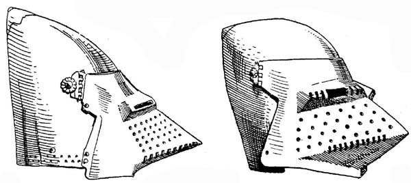 В Италии на горшковых шлемах появляются сначала окна для доступа воздуха в виде четырехугольных вырезов со стороной примерно 10-12 сантиметров. Окна закрывались при помощи железной дверки и маленького засова на правой геральдической5) стороне шлема. Это приспособление также свидетельствует об усилиях обеспечить воину необходимый доступ свежего воздуха.
