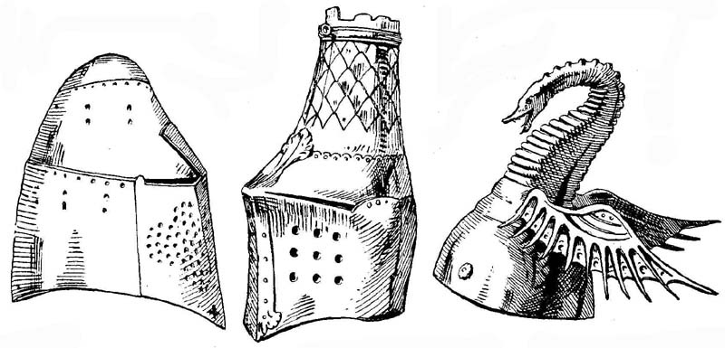 Теперь лицо полностью защищено стенкой шлема с вырезами для глаз (нем. Augenl?cher) или смотровой щелью (нем. Sehspalten). Часто пробиваются также отверстия для доступа воздуха. В результате появился так называемый горшковый шлем (нем. Topfhelm), служивший в разных формах головным убором рыцарей с середины XII до XIV века. Своему [30] возникновению горшковый шлем обязан чрезвычайно опасному действию сарацинских боевых палиц и секир, от которых неповоротливые крестоносцы сначала вовсе не могли защититься.