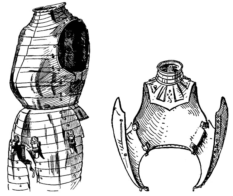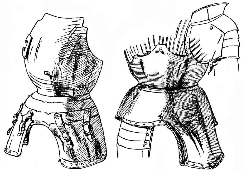 | Рис. 1. Сборный нагрудник. От доспеха венецианского военачальника Бартоломео Коллеони (ок. 1399—1475). Италия, ок. 1470 г. Рис. 2. Нагрудник, с ожерельем, юбкой и подвижными набедренниками. От максимилиановского доспеха Рупрехта Пфальцского (ум. 1504). Германия, ок. 1500 г. [75] |