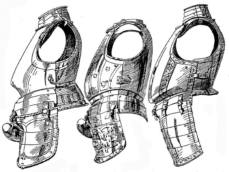 | Рис. 9. Нагрудник с тапулем, с юбкой, набедренниками и гульфиком. Германия, ок. 1540 г. Рис. 10. Нагрудник, с юбкой, набедренниками и гульфиком. Германия, 1547 г. Рис. 11. Нагрудник с гусиной грудью, с ожерельем и набедренниками; ожерелье сильно вытянуто вверх. Италия, ок. 1570 г. |