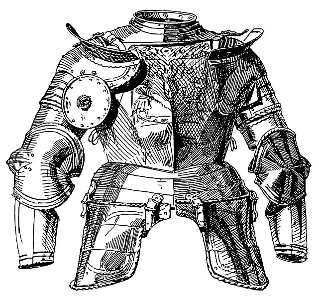 | Рис. 3. Ландскнехтский полудоспех. Состоит из ожерелья, наплечников с гребнями и подвижным диском с правой стороны, наручей с налокотниками — полными раковинами, нагрудника с острым тапулем, юбки и набедренников; нагрудник украшен травленым рисунком. Германия, ок. 1540 г. |