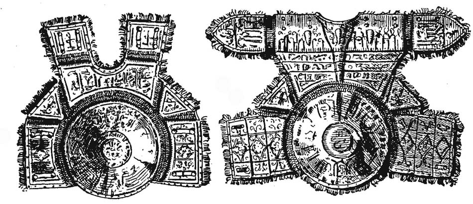 | Рис. 23. Зерцало Торгуда-реиса, короля Кайруана (ум. 1565). Работа арабского оружейника Али, XVI в. a) Нагрудник. b) Наспинник с наплечниками, железные части гравированы и позолочены. |