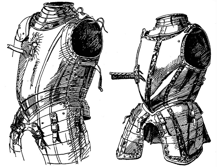 В Италии придумали другой способ защиты, который доставлял облегчение по крайней мере на марше. В итальянской легкой кавалерии около [79] 1560 года появилось особое устройство нагрудников, которое позволяло открывать их спереди наподобие камзола. На наспиннике для этого на каждой стороне укреплялось по шарниру, а спереди в случае надобности застегивалось крючками (рис. 15). Они использовались до 1580 года и у немецкой конницы. Это устройство не было новым изобретением, а лишь возвратом к лентнеру, который тоже застегивался на груди, как мы увидим позже.